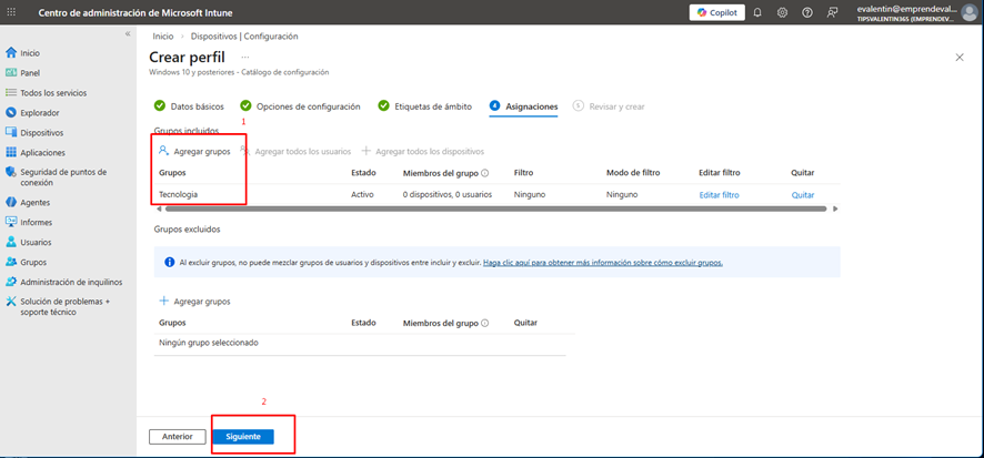 Paso 3. Avanza hasta la pestaña de Asignaciones. Haz clic en Agregar grupos dentro de la sección Grupos incluidos y selecciona el grupo de dispositivos o usuarios al que deseas aplicar esta política. Una vez seleccionado el grupo haz clic en Siguiente para continuar.