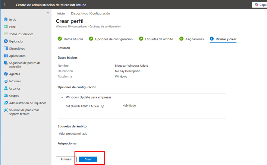 Paso 4. En la pantalla de Revisar y crear revisa el resumen completo de la política. Verifica que el nombre sea correcto, que la configuración Set Disable UXWU Access esté en estado Habilitado y que las asignaciones sean las esperadas. Cuando todo esté correcto haz clic en Crear para publicar la política.