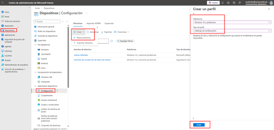Paso 1. Accede al portal de Microsoft Intune en https://intune.microsoft.com. En el panel lateral izquierdo selecciona Dispositivos y luego haz clic en Configuración. A continuación haz clic en Crear y selecciona Nueva directiva. En el panel que se abre a la derecha selecciona como Plataforma Windows 10 y posteriores y como Tipo de perfil el Catálogo de configuración. Haz clic en Crear para continuar.