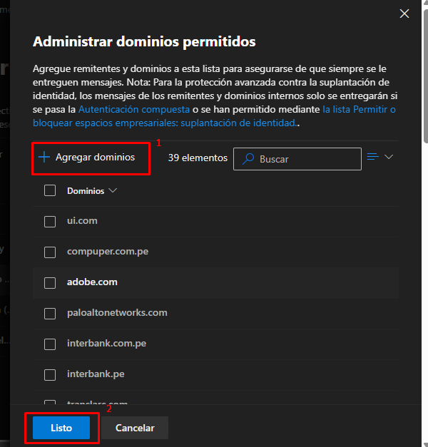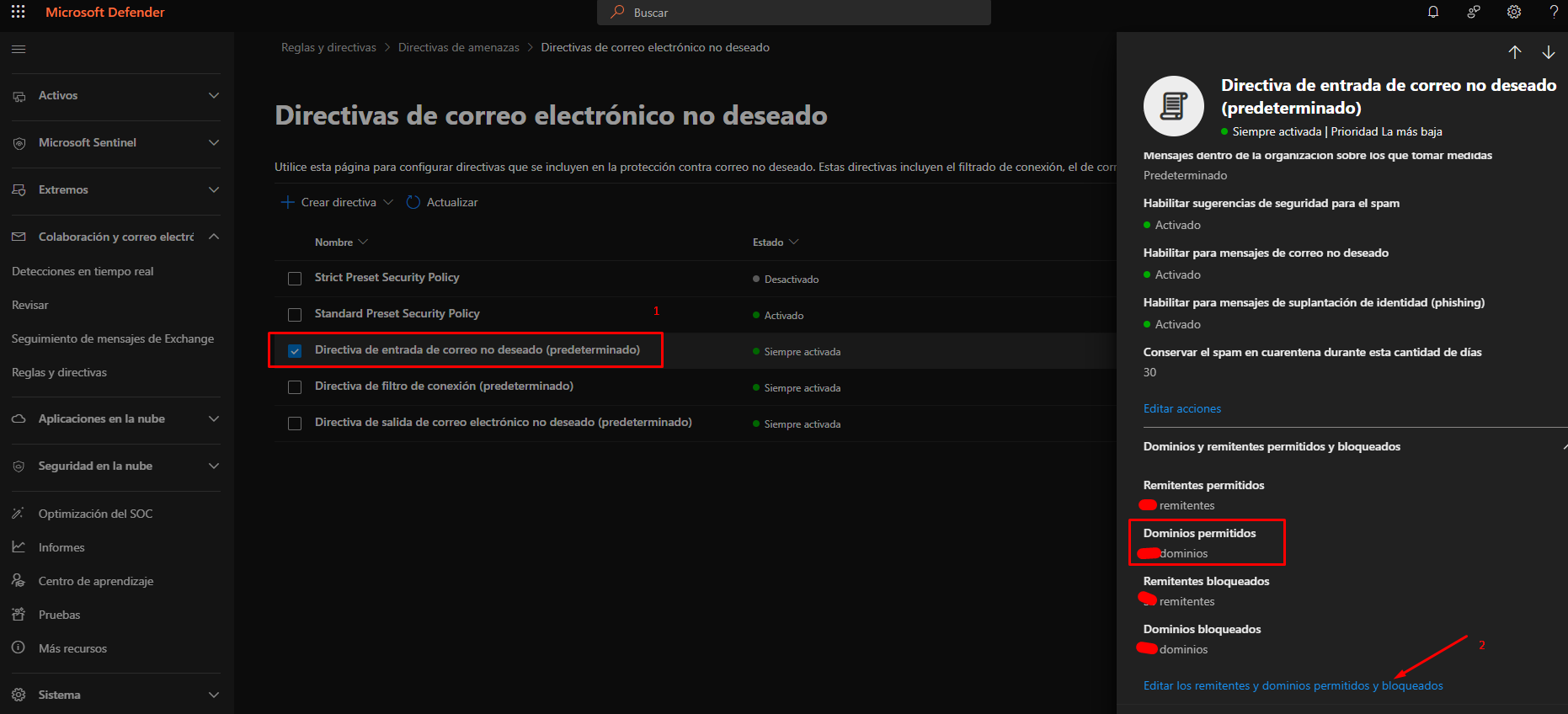 2. Permitir dominios confiables (Allow domains) en la política Anti-spam inbound