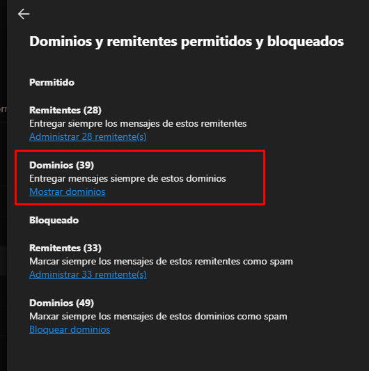 Dentro de Allowed and blocked senders and domains, selecciona la opción Allow domains para administrar los dominios que siempre deben entregarse como legítimos.