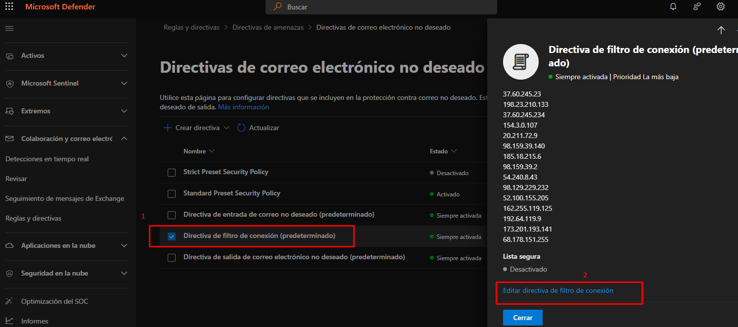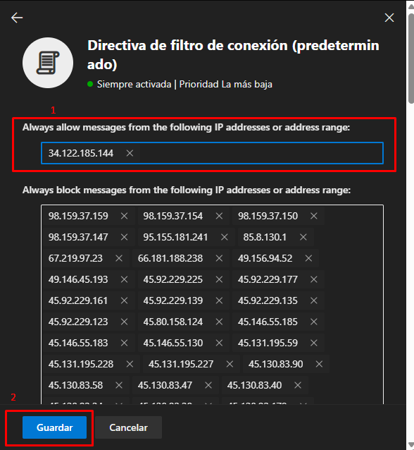 1. Permitir IPs confiables (Connection filter policy)
